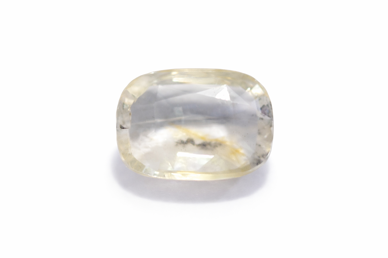 This natural white sapphire displays a subtle champagne undertone blended with a near-colorless body, giving it a warm yet delicate appearance. The gemstone is fashioned in a rectangular cushion cut with softly rounded corners that create a balance between vintage charm and modern elegance.