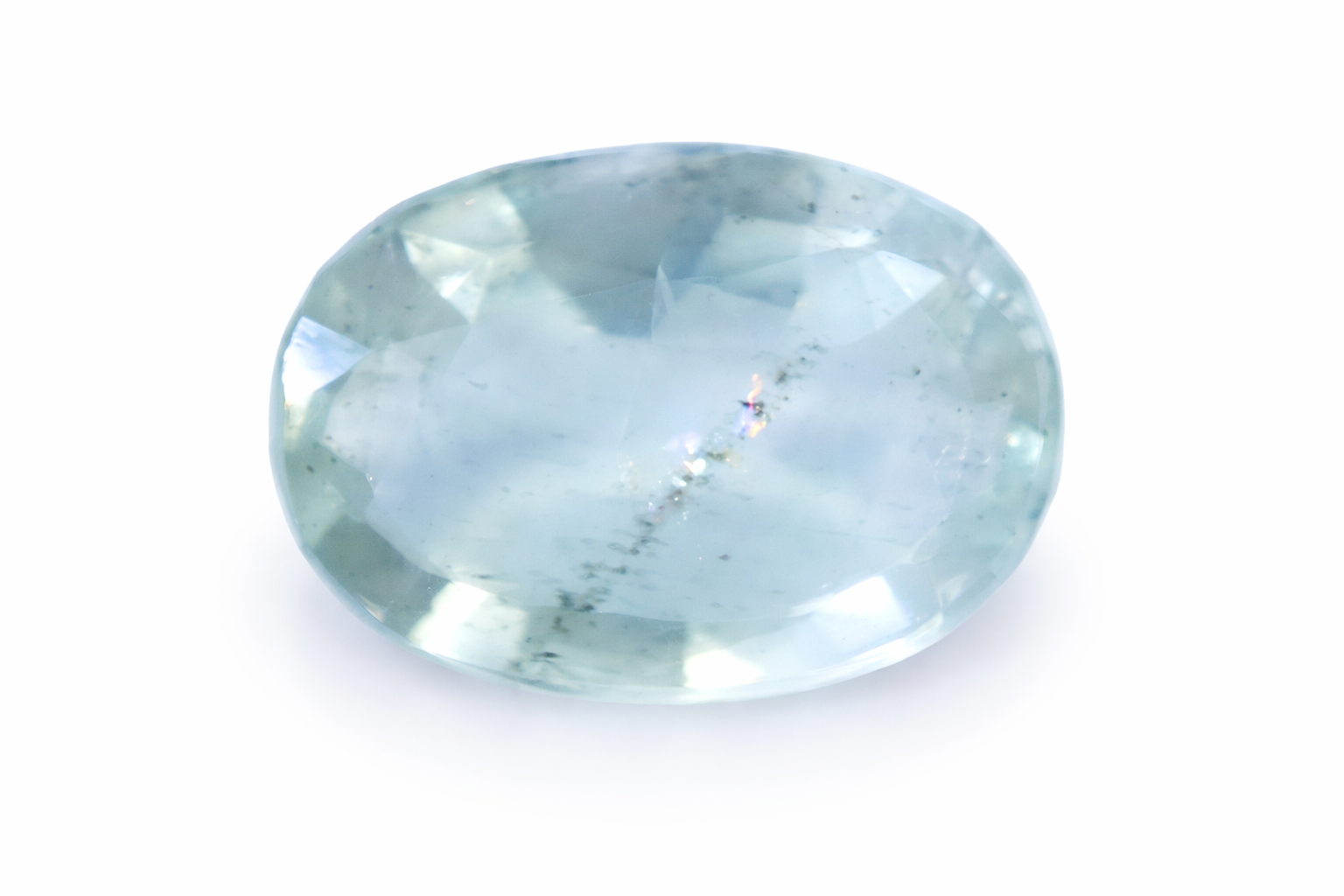 This Natural Blue Aquamarine features a soft light blue to aqua-green hue with a classic oval mixed faceted cut, designed to enhance light reflection across its surface.