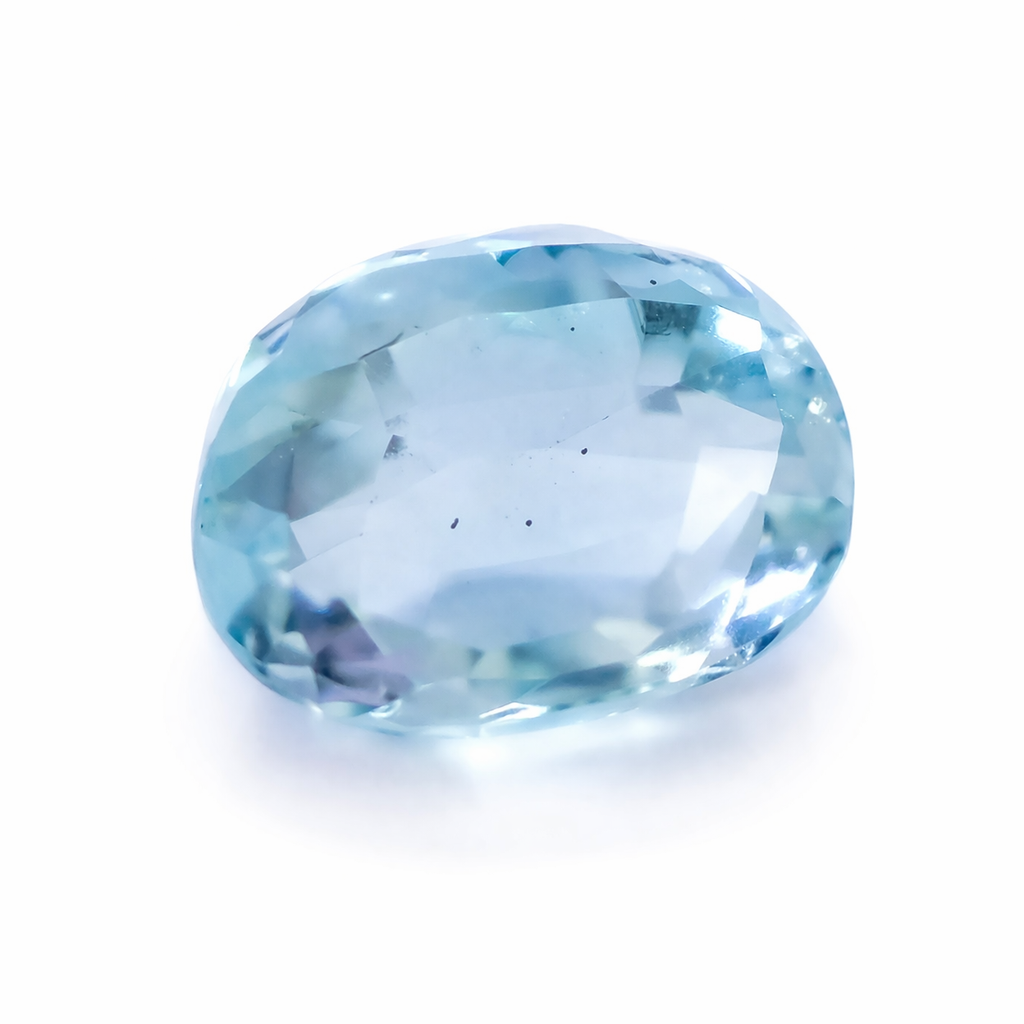 This Natural Blue Aquamarine features a pale blue to near-colorless tone, offering a soft and subtle visual appeal. The oval mixed faceted cut enhances light reflection, creating a gentle shimmer across the gemstone.