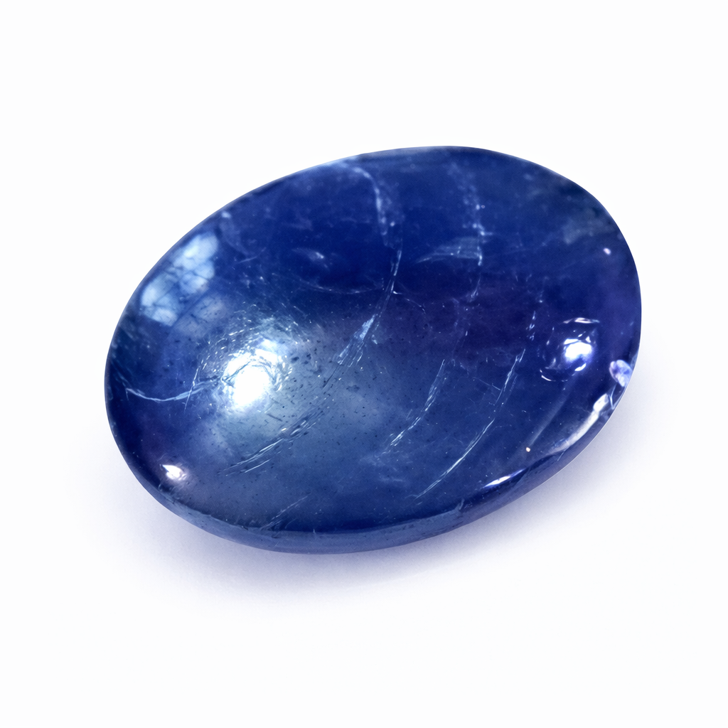This Natural Blue Sapphire (Neelam) features a classic oval shape with a smooth semi-cabochon style surface that highlights the gemstone’s natural character and internal mineral structures.