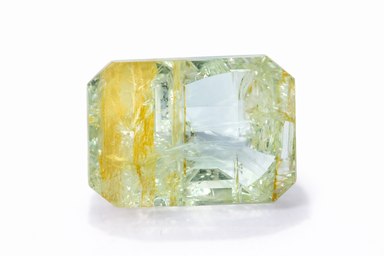 • Light aqua tone with yellowish inclusions