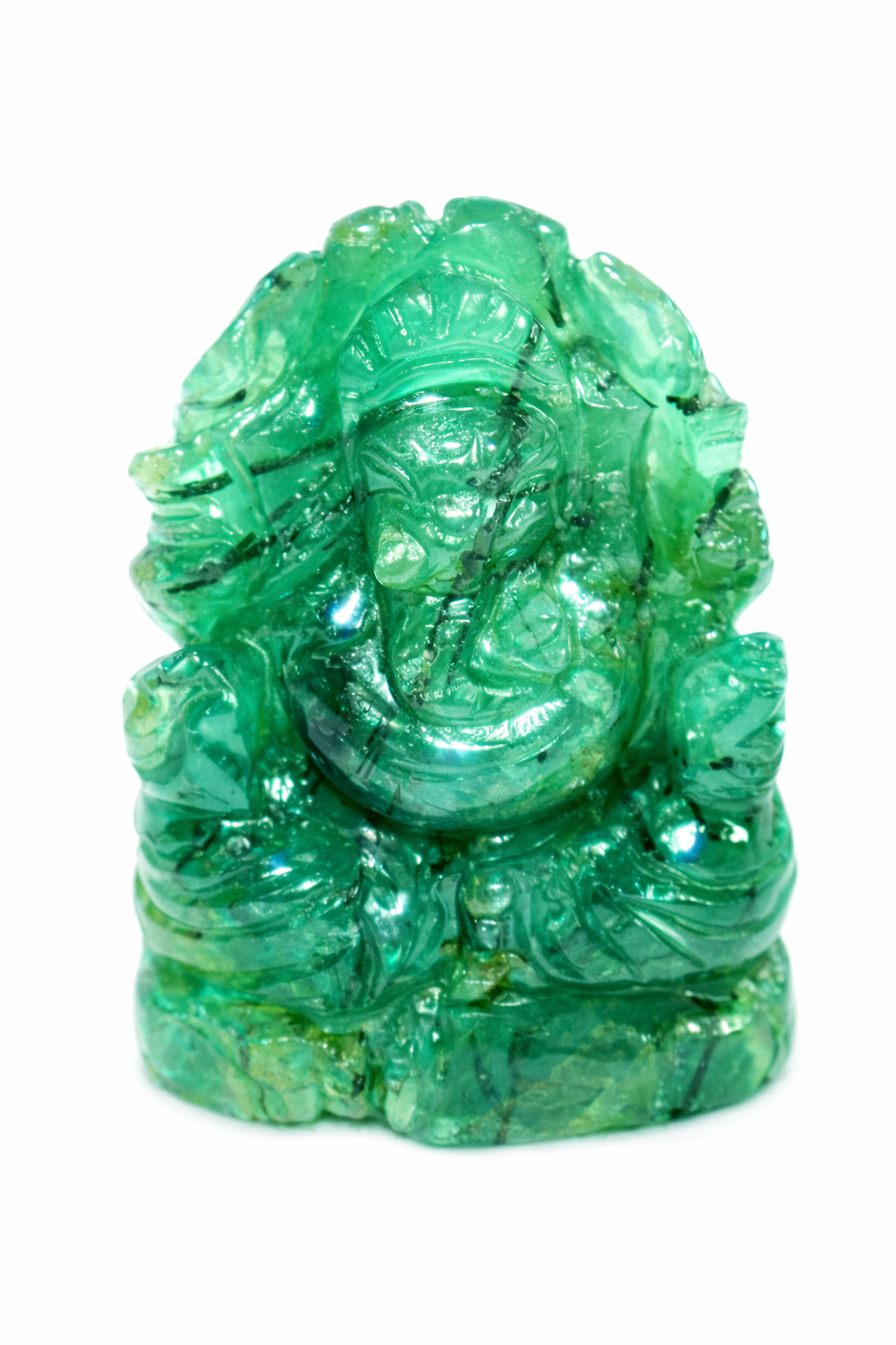 Expert artisans have carefully carved the gemstone to bring out the divine form of Shri Ganesh, maintaining the natural beauty and translucency of the emerald. The polished surface highlights the gemstone’s vibrant green tone while preserving its natural internal character.