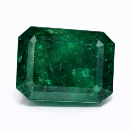 The step-cut facets allow light to pass through the gemstone in broad flashes, highlighting the stone’s natural color depth and internal structure. This cutting style is specifically designed for emeralds because it enhances durability while showcasing the gemstone’s transparency.