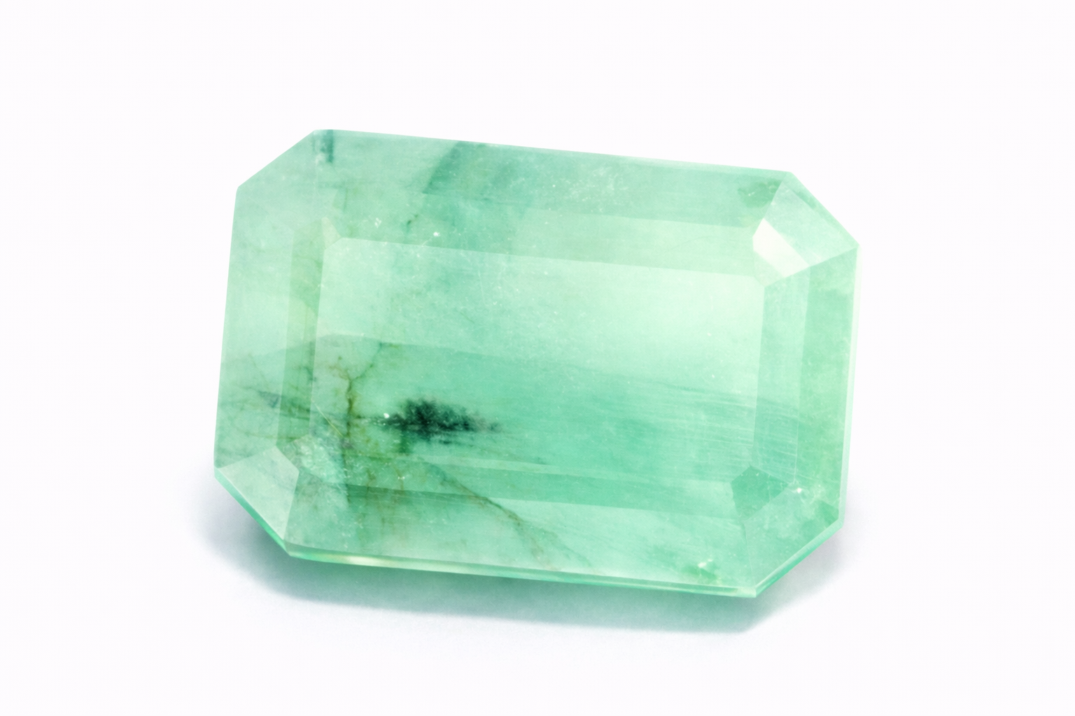 This Natural Emerald (Panna) displays a soft light green body color with a classic octagonal step cut, commonly known as the emerald cut. This cut is traditionally used for emeralds because it highlights the gemstone’s natural clarity, internal structure, and elegant appearance.