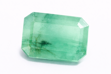 The step cut facets allow light to reflect in elegant flashes across the gemstone’s surface, highlighting the emerald’s depth of color and natural transparency. This cut also protects the stone from damage and enhances durability when mounted in jewelry.