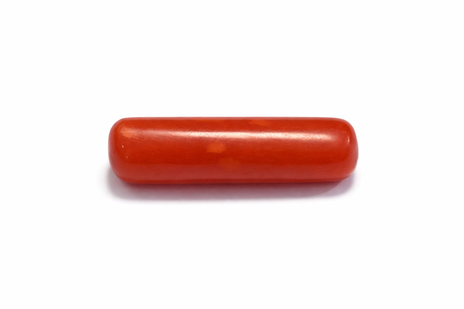 This natural Red Coral (Moonga) showcases a strong, even red to deep vermilion body color with a refined cylindrical profile. The gemstone features a smooth, uniform surface polish with a soft waxy luster, characteristic of genuine natural coral.