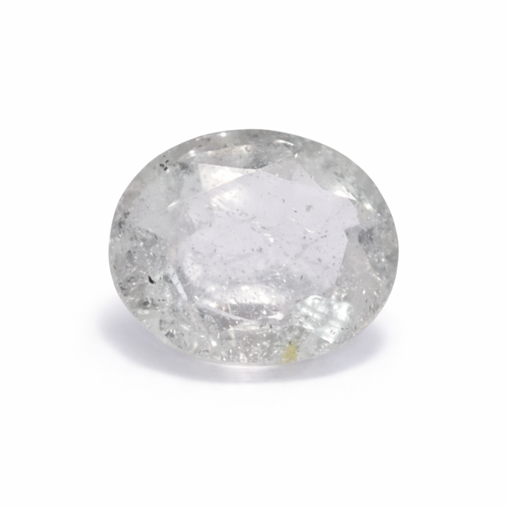 This natural white sapphire is cut in a balanced oval mixed style, offering a pleasing shape suitable for a variety of jewelry settings. The gemstone displays a translucent to semi-transparent icy-white body with multiple visible natural inclusions that create a unique internal pattern.